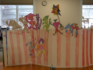 kids' class, which was both kids and adults, we made a papertoy dogsled team. Fold a sheet of paper in half lengthwise. fold up a 1/2" edge/lip along the existing fold edge. Then we drew dog figures created by drawing rectangles and triangles. Class drew along with me. There is plenty of leeway in how to draw these dogs.